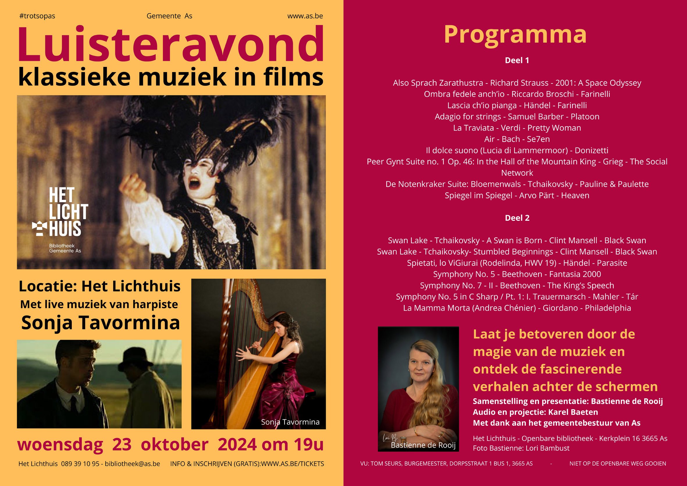 De avond zal in het teken staan van ‘Klassieke muziek in films.’ De Luisteravond start om 19 u met prachtige livemuziek van harpiste Sonja Tavormina en een vuurspektakel.
